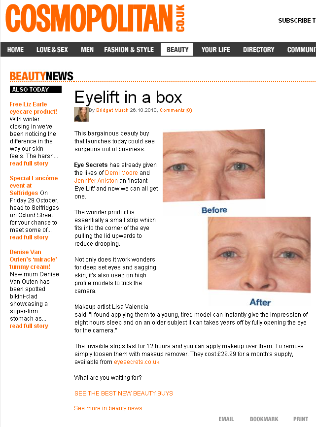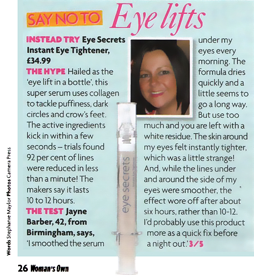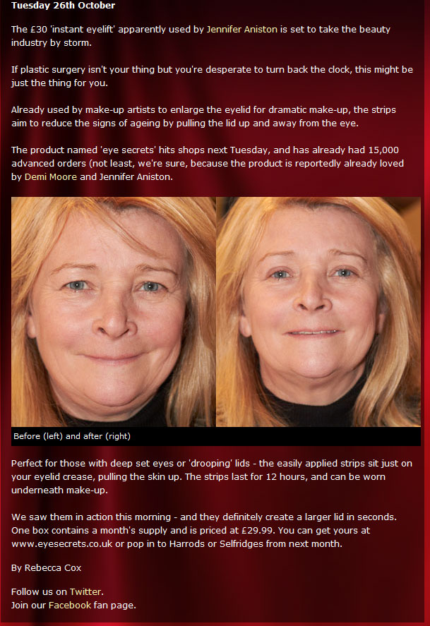 "Eye Secrets are an essential for my kit; they're easy to apply and are completely invisible. The celebrities were amazed at the results from using these ingenious little strips. The Eye Secrets Instant Eye Tightener looks cool in a mock syringe casing with sensational instant results. The Eye Secrets range is a hit with the whole cast who couldn't wait to get their hands on the products for themselves."
