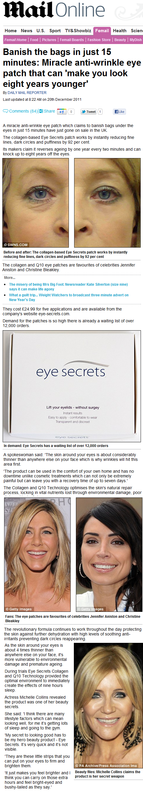 "Eye Secrets are an essential for my kit; they're easy to apply and are completely invisible. The celebrities were amazed at the results from using these ingenious little strips. The Eye Secrets Instant Eye Tightener looks cool in a mock syringe casing with sensational instant results. The Eye Secrets range is a hit with the whole cast who couldn't wait to get their hands on the products for themselves."